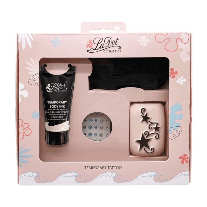 - SET 4 - Mit dem LaDot Tattoo Set bekommst du das komplette Zubehör für dein temporäres Tattoo. Im Set enthalten ist 1 Tattoo Stempel medium, 1 Tube 15 ml schwarze, hypoallergene und wasserfeste Farbe, 1 Stempelkissen mittel (7,5 x 3,5 cm) und 80 Klebe-Strasssteine.
