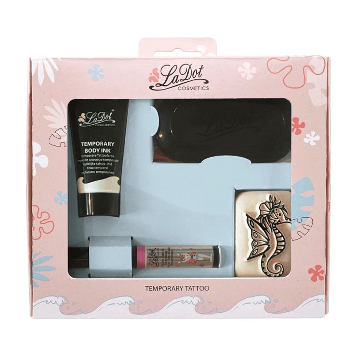 • SET M - Mit dem LaDot Tattoo Set bekommst du das komplette Zubehör für dein temporäres Tattoo. Im Set enthalten ist 1 Tattoo Stempel medium, 1 Tube 15 ml schwarze, hypoallergene und wasserfeste Farbe, 1 Stempelkissen mittel (7,5 x 3,5 cm) und 80 Klebe-Strasssteine.