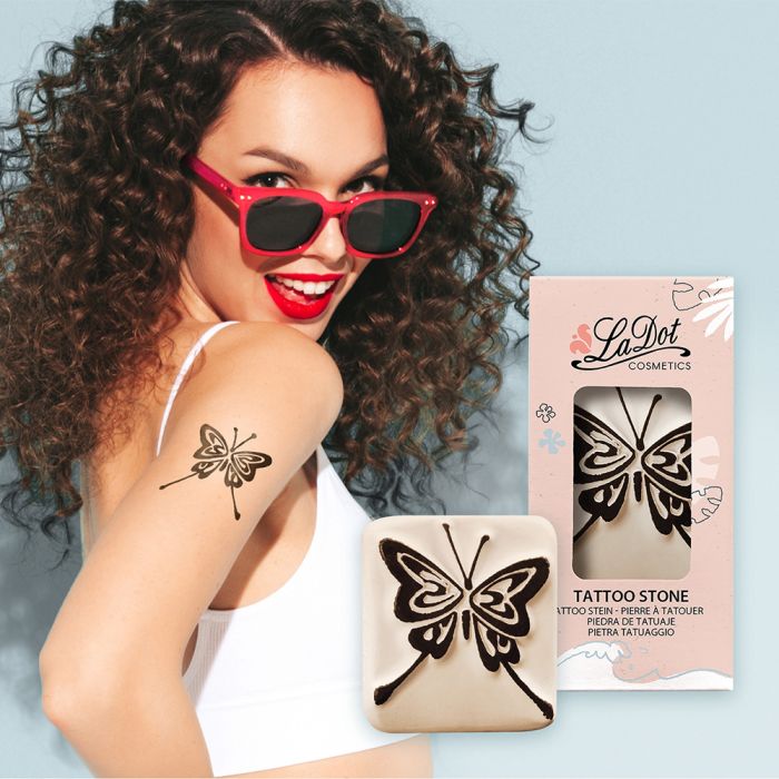 Der große LaDot Stein mit einem einzigartigen Schmetterlings-Abdruck - Verleihen Sie Ihrem Look mit unserem LaDot Stempel eine exklusive Note. Die Steine, gefertigt aus hochwertiger Keramik, werden mit präziser Handwerkskunst leicht gewölbt, um bei jedem Abdruck ein perfektes Ergebnis zu garantieren. Sie weisen eine Größe von 4,5 x 4 cm auf. Die verspielte Schmetterlingsgrafik verleiht den Steinen eine charmante Ausstrahlung und macht sie besonders für Kinder oder Tierliebhaber attraktiv. Die Vielseitigkeit dieser Steine zeigt sich darin, dass verschiedene Motive mühelos miteinander kombiniert werden können. Egal, ob am Strand, im Urlaub, auf dem nächsten Festival oder der anstehenden Wochenendparty - die LaDot Stones sind für jeden Anlass geeignet. Wählen Sie ein neues Tattoo passend zu Ihrer Stimmung und Ihrem Stil. Unsere temporären Tattoos sind nicht nur hautfreundlich und hypoallergen, sondern auch zertifiziert und vegan, was unser Engagement für Qualität und ethische Produktion unterstreicht.