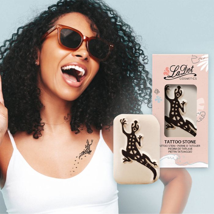 Der mittelgroße LaDot Stein im Abdruckdesign einer Eidechse - Erhöhen Sie Ihren Stil mit unserem LaDot Stempel mit einem einzigartigen Eidechsenaufdruck. Die aus hochwertiger Keramik gefertigten Steine werden in feiner Handarbeit mit einer leichten Wölbung hergestellt, um jedes Mal einen perfekten Aufdruck zu gewährleisten. Das Eidechsenmotiv verleiht den Steinen eine verspielte Note und macht sie zu einer idealen Wahl für Kinder oder Tierliebhaber. Diese Steine sind nicht auf ein einziges Design beschränkt - die Motive lassen sich mühelos kombinieren. Ob am Strand, im Urlaub, auf dem nächsten Festival oder der nächsten Wochenendparty - die LaDot Stones sind vielseitig einsetzbar und passen zu jeder Gelegenheit. Wähle ein neues Tattoo, das zu deiner Stimmung und deinem Stil passt. Unsere temporären Tattoos sind auch hautfreundlich und hypoallergen, so dass sie sowohl für Erwachsene als auch für Kinder geeignet sind. LaDot Steine sind zertifiziert und vegan, was unser Engagement für Qualität und ethische Produktion widerspiegelt.